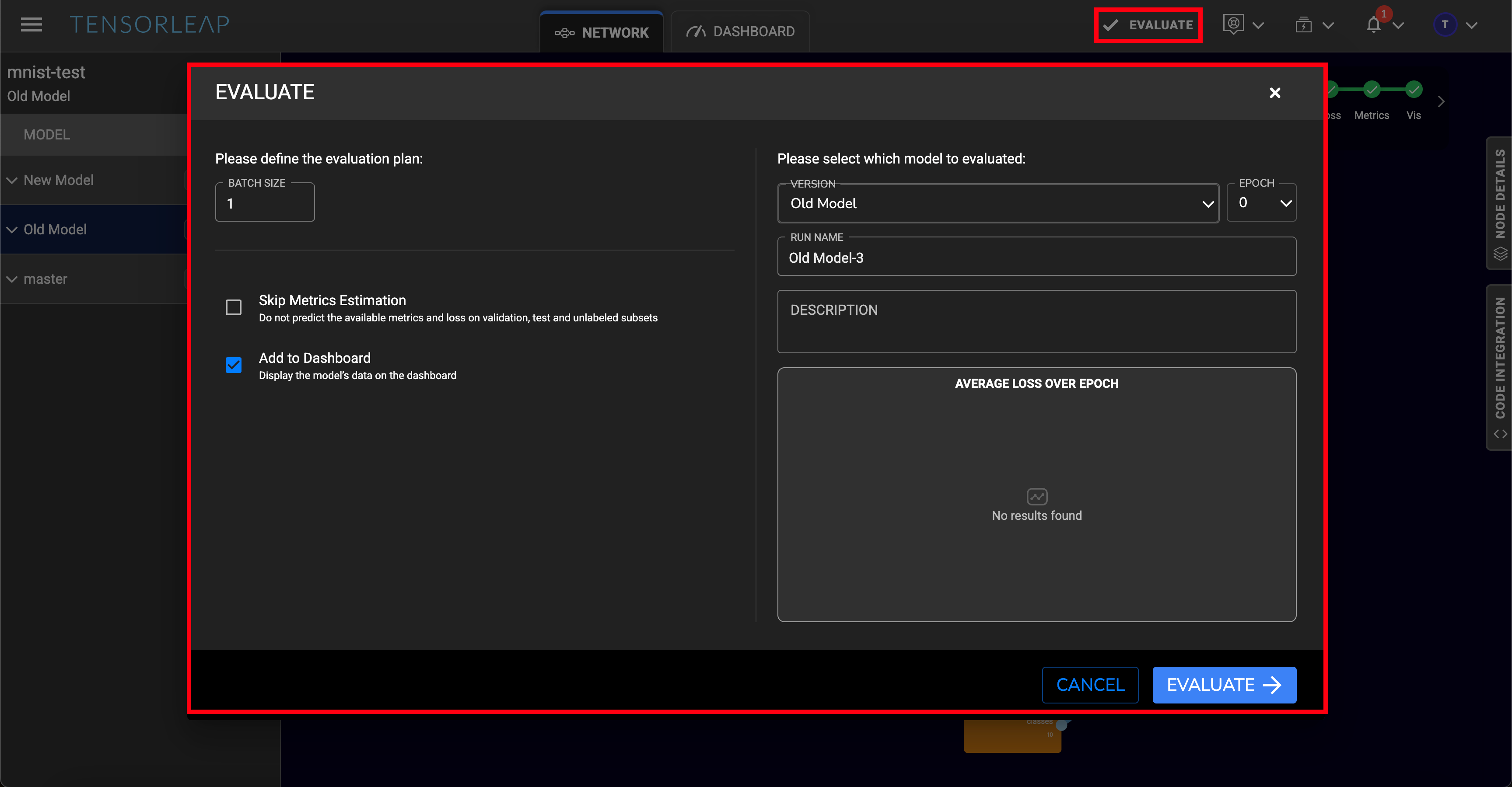 * **Add to Dashboard -** This would add the evaluated model to the selected model for analysis in the [dashboard](https://docs.tensorleap.ai/user-interface/project/dashboards) panel