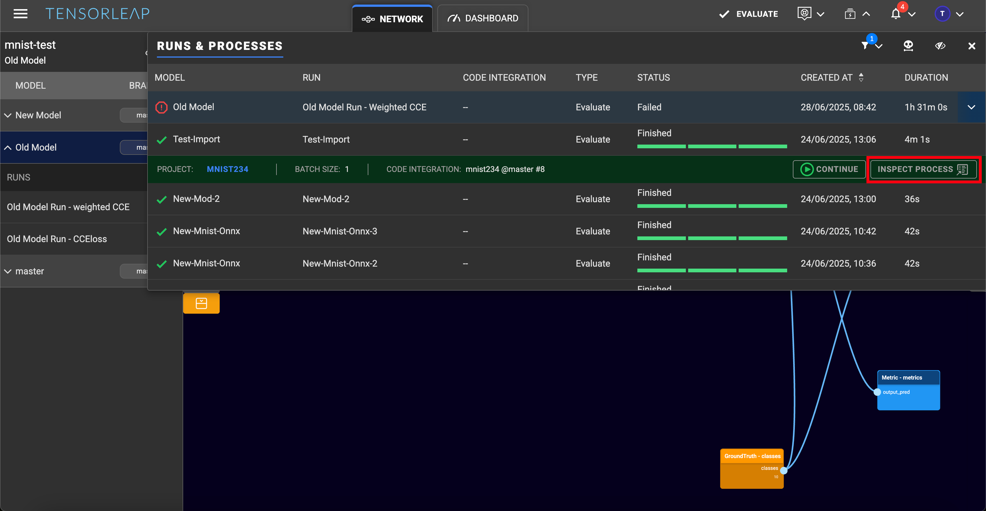 * The [Code Integration](https://docs.tensorleap.ai/user-interface/network/code-integration/code-version-controller#script-versioning-at-tensorleap) Name, branch, and version that is used by the process